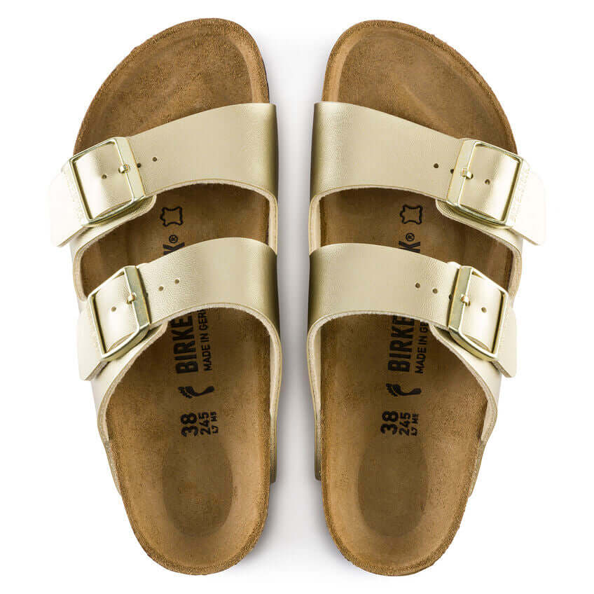 An icon of timeless design and legendary comfort, the Arizona sandal has been defining style since 1973. An electric gold finish transforms the classic look into your favorite be-seen pair, outfitted with tonal buckles to elevate the look. Complete with classic BIRKENSTOCK design elements, like a contoured cork-latex footbed for the ultimate in support.